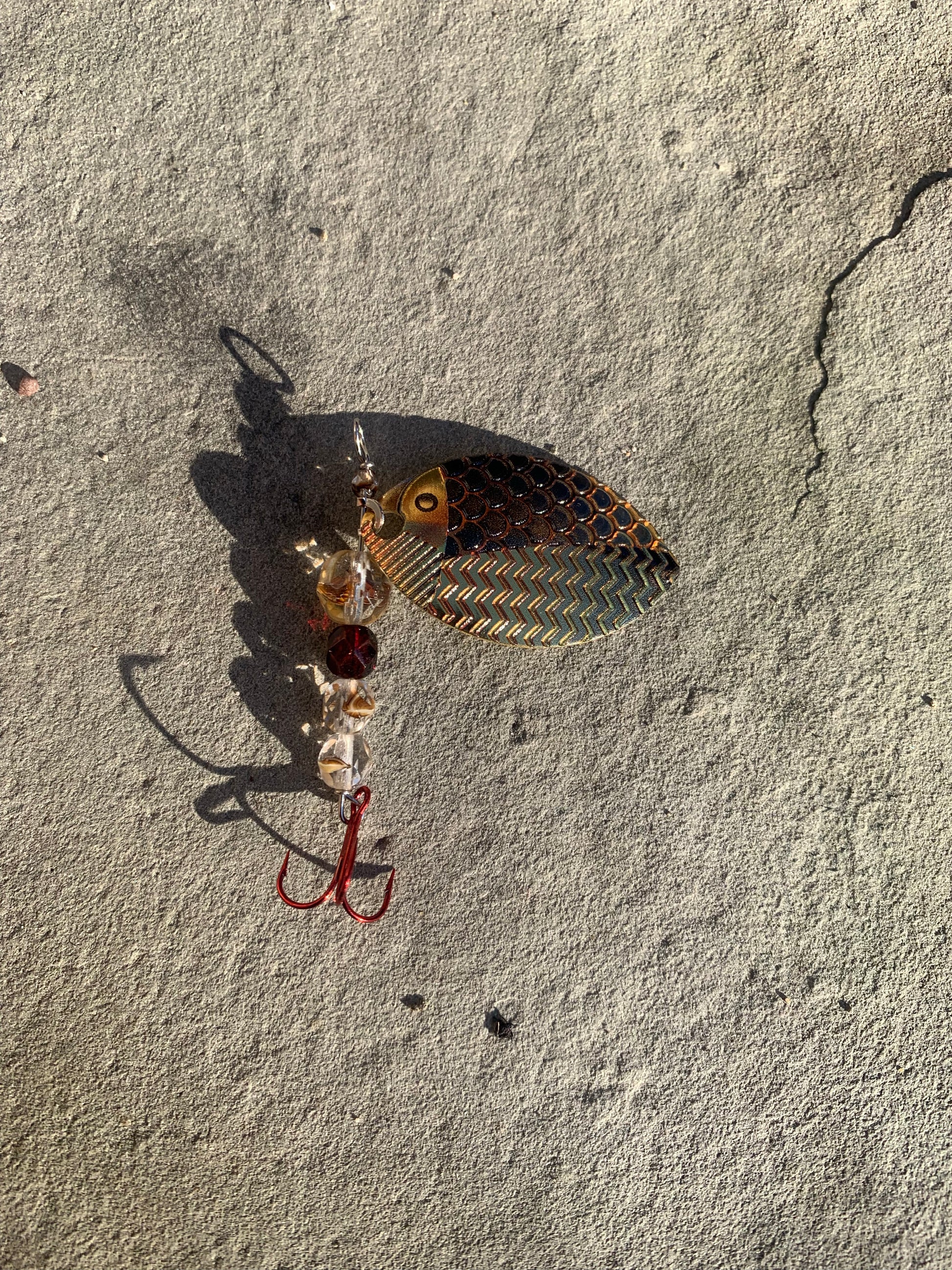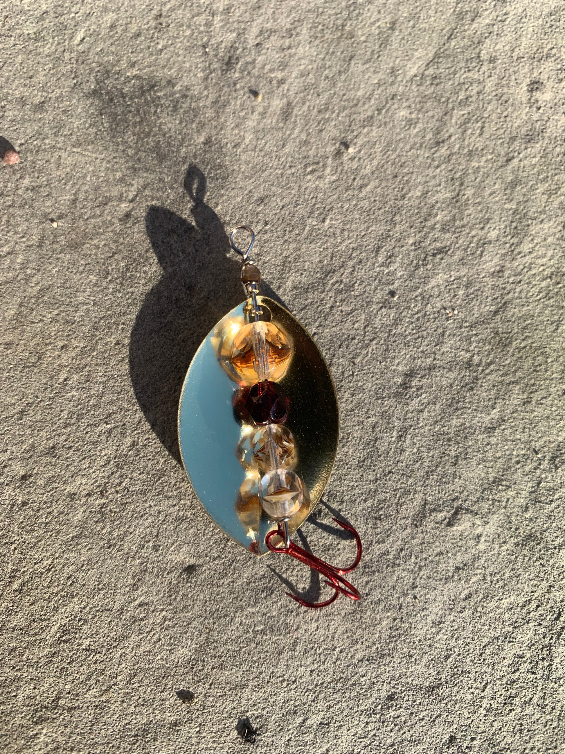 This spinner is done up with a custom designed real feel size 4 blade, paired with brown and clear glass beads and finished off with a size 12 red treble. It’s easily one of the most effective designs I’ve ever created and famously caught a massive Steelhead Trout out of Lake Erie tributaries on only its 5th cast!